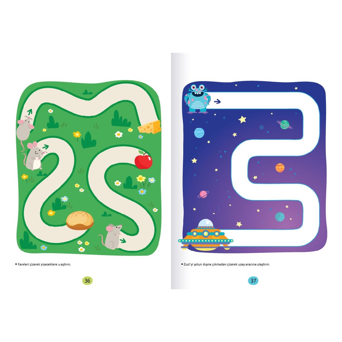 Çocuklar kitaptaki sınırlı boyamaları yaparak, okları takip ederek ve kesik çizgileri birleştirerek yazma becerilerini geliştirebilecekler. Çocukların kolay egzersizleri başarması motivasyonlarını arttırarak onları daha ileri düzeydeki çalışmalara hazırlayacaktır. Kitaptaki özenle çizilmiş renkli resimler, çocukların yaratıcılık becerilerini de destekler niteliktedir. Bu egzersizler sayesinde çocuklar eğlenceli vakit geçirirken, aynı zamanda okula hazırlanmak için de mükemmel bir ilk adım atmış olacaklar.