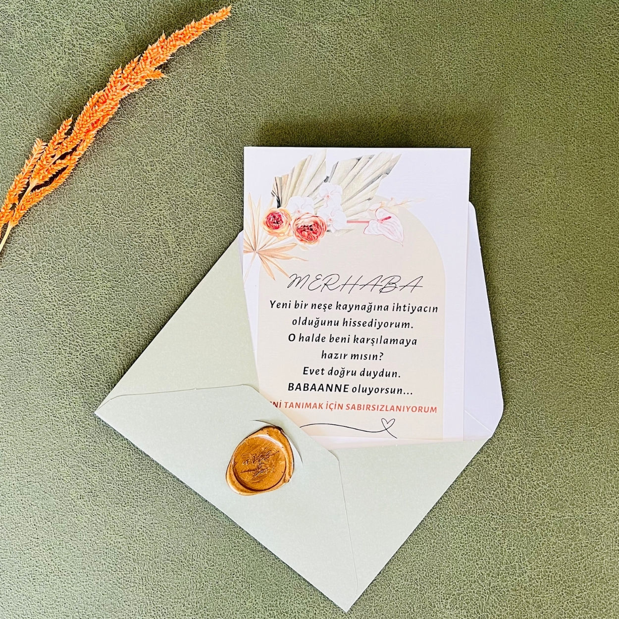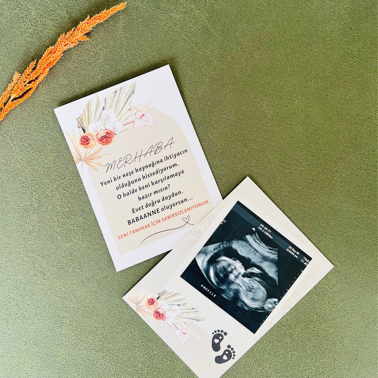 Hamile olduğunuz haberini sevdiklerinizle paylaşma anınızı keyifli bir anıya dönüştürebilmeniz için bebek müjde kartlarımızı tasarladık. Kartlarımızın bir yüzünde yer alan bebek ultrason fotoğrafı ile annenize ilk ip ucunu verirken, diğer yüzünde yer alan duygu dolu bir yazı ile de kendisine “Babaanne” olacağı müjdesini verebilirsiniz. Bebek müjde kartlarımız özel Tuale kağıda basılmıştır. Her bir müjde kartımız sizin tercihinize göre seçilmiş renkteki zarfın içine koyularak şık bir mum mühür ile mühürlenir. Zarfı vereceğiniz kişinin sürpriz haberi anlamaması için zarfın üzerine “A Special Gift To You” yazısı yazılır. Böylece zarfı vereceğiniz kişi zarfın içinde kendisi için özel bir hediye olduğunu düşünür. Sizleri şimdiden tebrik eder, bebeğinizi sağlıkla kucağınıza almanızı dileriz…