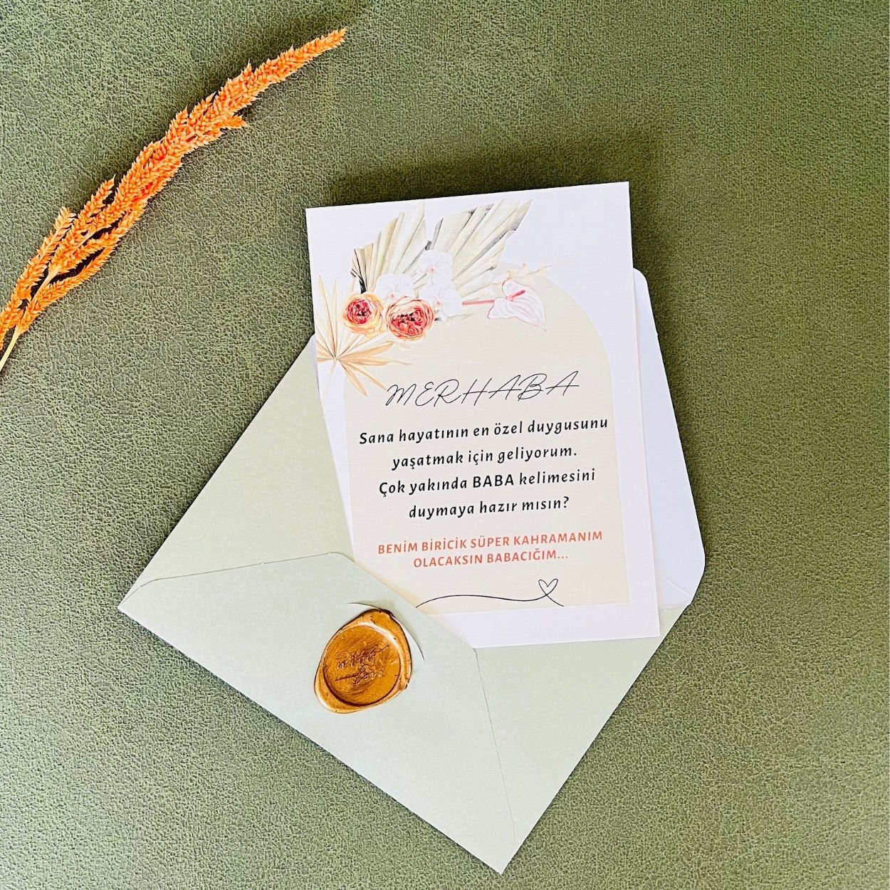 tercihinize göre seçilmiş renkteki zarfın içine koyularak şık bir mum mühür ile mühürlenir. Zarfı vereceğiniz kişinin sürpriz haberi anlamaması için zarfın üzerine “A Special Gift To You” yazısı yazılır. Böylece zarfı vereceğiniz kişi zarfın içinde kendisi için özel bir hediye olduğunu düşünür. Sizleri şimdiden tebrik eder, bebeğinizi sağlıkla kucağınıza almanızı dileriz…