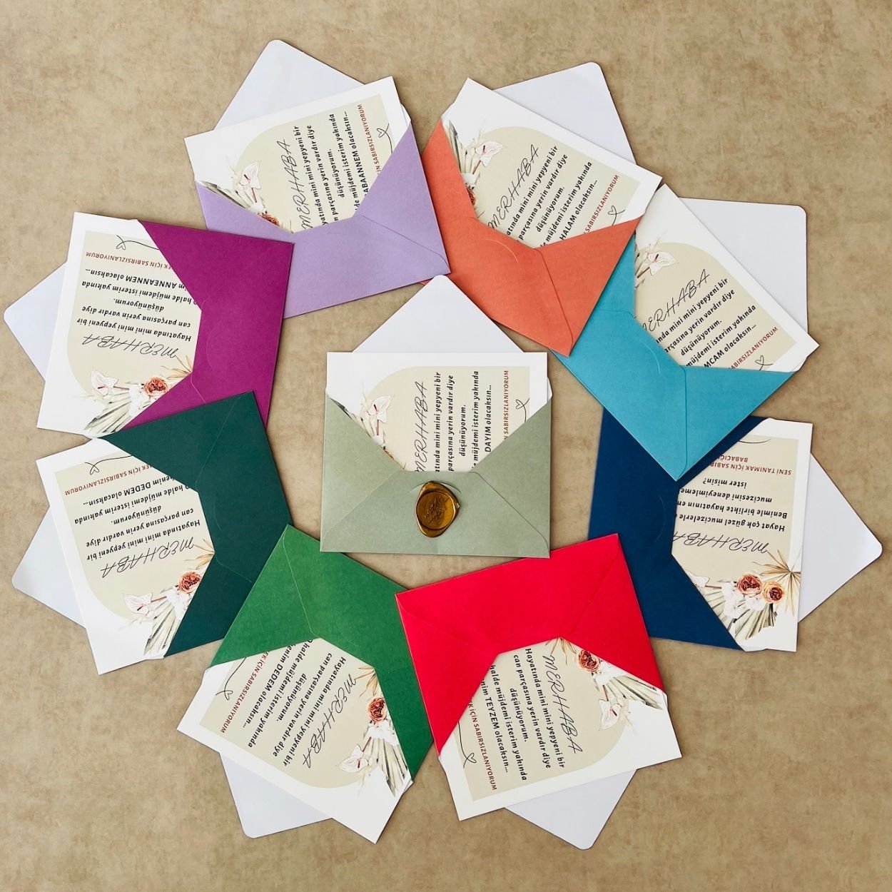Bebek müjde kartlarımız özel Tuale kağıda basılmıştır. Her bir müjde kartımız sizin tercihinize göre seçilmiş renkteki zarfın içine koyularak şık bir mum mühür ile mühürlenir.