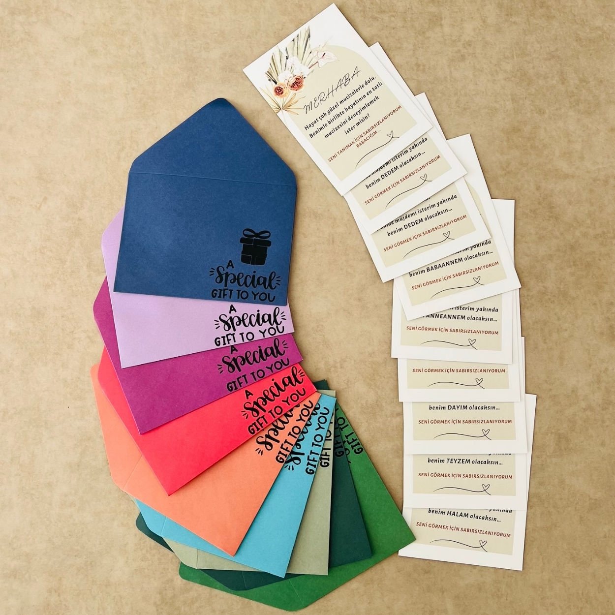 Bu setimizin içinde toplamda 9 farklı zarf ve 9 farklı bebek müjde kartı yer alır. Müjde kartları “Baba-Teyze-Hala-Amca-Dayı-Anneanne-Babaanne-2 Dede”ye hitaben hazırlanmıştır. Böylece tüm sevdiklerinize haberi farklı birer zarf ile müjdeleyebileceksiniz.