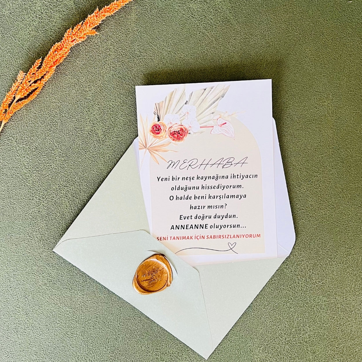 Hamile olduğunuz haberini sevdiklerinizle paylaşma anınızı keyifli bir anıya dönüştürebilmeniz için bebek müjde kartlarımızı tasarladık. Kartlarımızın bir yüzünde yer alan bebek ultrason fotoğrafı ile annenize ilk ip ucunu verirken, diğer yüzünde yer alan duygu dolu bir yazı ile de kendisine “Anneanne” olacağı müjdesini verebilirsiniz. Bebek müjde kartlarımız özel Tuale kağıda basılmıştır. Her bir müjde kartımız sizin tercihinize göre seçilmiş renkteki zarfın içine koyularak şık bir mum mühür ile mühürlenir. Zarfı vereceğiniz kişinin sürpriz haberi anlamaması için zarfın üzerine “A Special Gift To You” yazısı yazılır. Böylece zarfı vereceğiniz kişi zarfın içinde kendisi için özel bir hediye olduğunu düşünür Sizleri şimdiden tebrik eder, bebeğinizi sağlıkla kucağınıza almanızı dileriz…