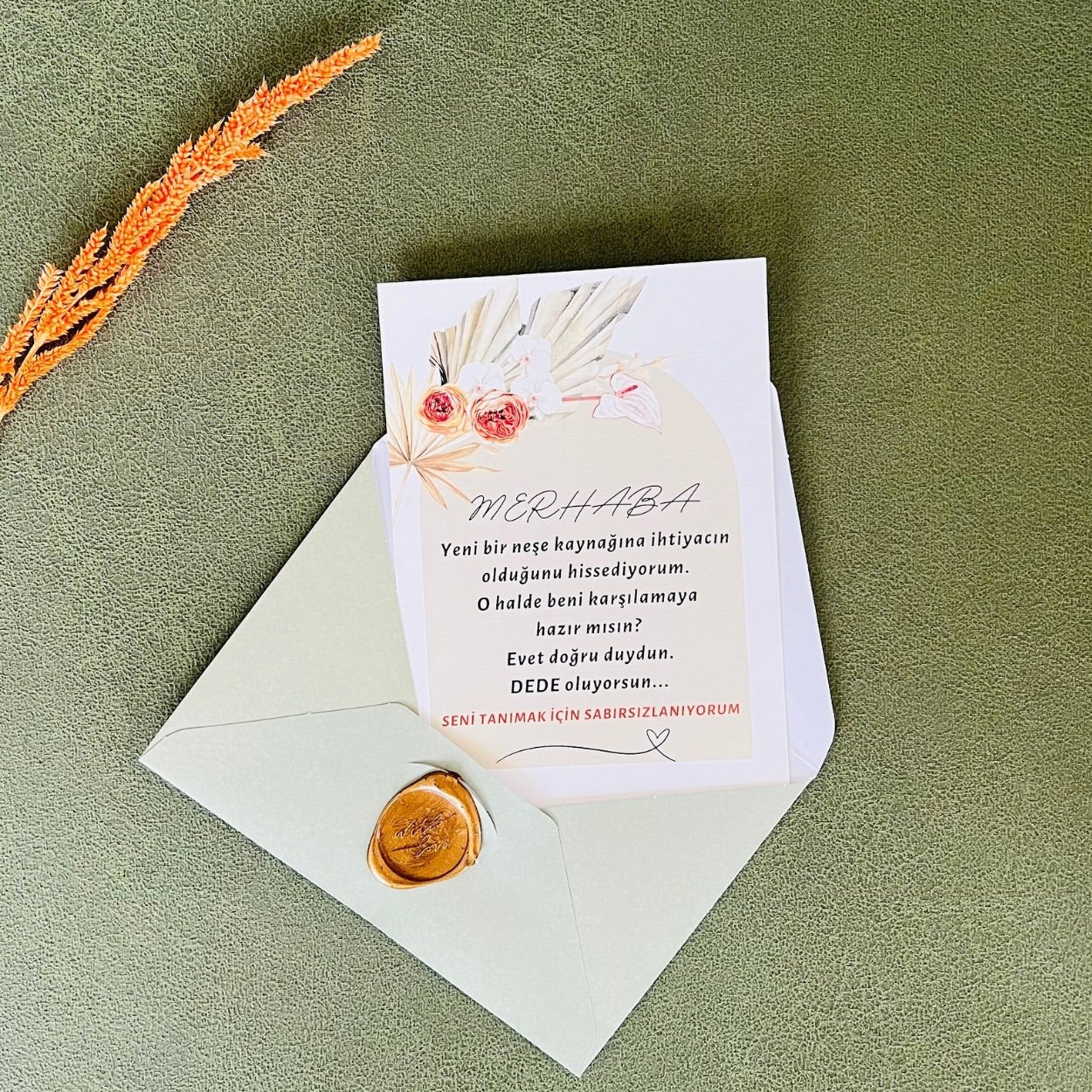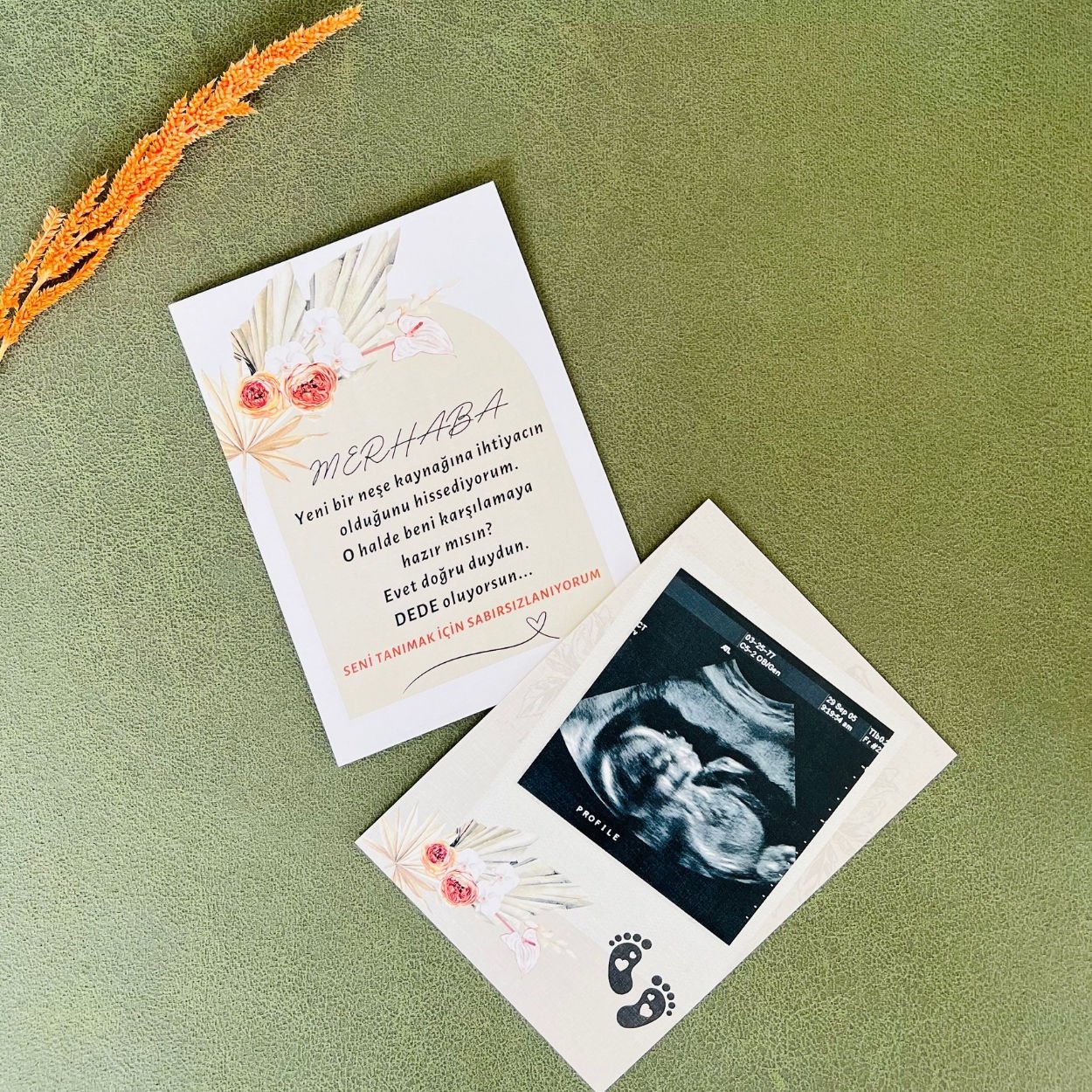 Hamile olduğunuz haberini sevdiklerinizle paylaşma anınızı keyifli bir anıya dönüştürebilmeniz için bebek müjde kartlarımızı tasarladık.Kartlarımızın bir yüzünde yer alan bebek ultrason fotoğrafı ile Babanıza ilk ip ucunu verirken, diğer yüzünde yer alan duygu dolu bir yazı ile de kendisine “Dede” olacağı müjdesini verebilirsiniz. Bebek müjde kartlarımız özel Tuale kağıda basılmıştır. Her bir müjde kartımız sizin tercihinize göre seçilmiş renkteki zarfın içine koyularak şık bir mum mühür ile mühürlenir. Zarfı vereceğiniz kişinin sürpriz haberi anlamaması için zarfın üzerine “A Special Gift To You” yazısı yazılır. Böylece zarfı vereceğiniz kişi zarfın içinde kendisi için özel bir hediye olduğunu düşünür. Sizleri şimdiden tebrik eder, bebeğinizi sağlıkla kucağınıza almanızı dileriz…
