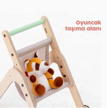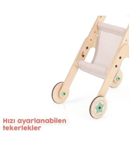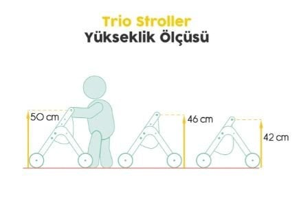 Trio Stroller ilk adım arabası ve oyuncak bebek arabasıdır. Anne-baba ve çocuk ile birlikte kolayca kurulmaktadır. Bebeklerin ilk adımlarını güvenle atmasına olanak verir. Ayrıca 43 cm'den 54 cm'e kadar uzayabilen ve tutma kulbu sayesinde her aydaki bebeğin boyuna göre ayarlanabilir ürün boyuna sahiptir. Doğal ahşap ve pamuklu kumaş malzemesi birlikte kullanılmıştır. Hafif ve kolay yönlendirilebilen bu ürün dış mekanda da rahatça kullanıllanılabilinir. Ayrıca tekerlerde bulunan patentli detay ile istenilirse ürünün hızı ayarlanabilir, çok hızlı gitmesi engellenebilir ve yürüme yardımcısı olarak kullanılabilir. Tekerler, dolgu (EVA) tekerdir ve patlama riski yoktur, uzun yıllar kullanmaya olanak verir. Gövdesi tamamen ahşap malzeme kullanılarak, CE (EN71 1/2/3) normlarına uygun üretilmiştir ve üzerinde herhangi zararlı bir kimyasal kullanılmamıştır.